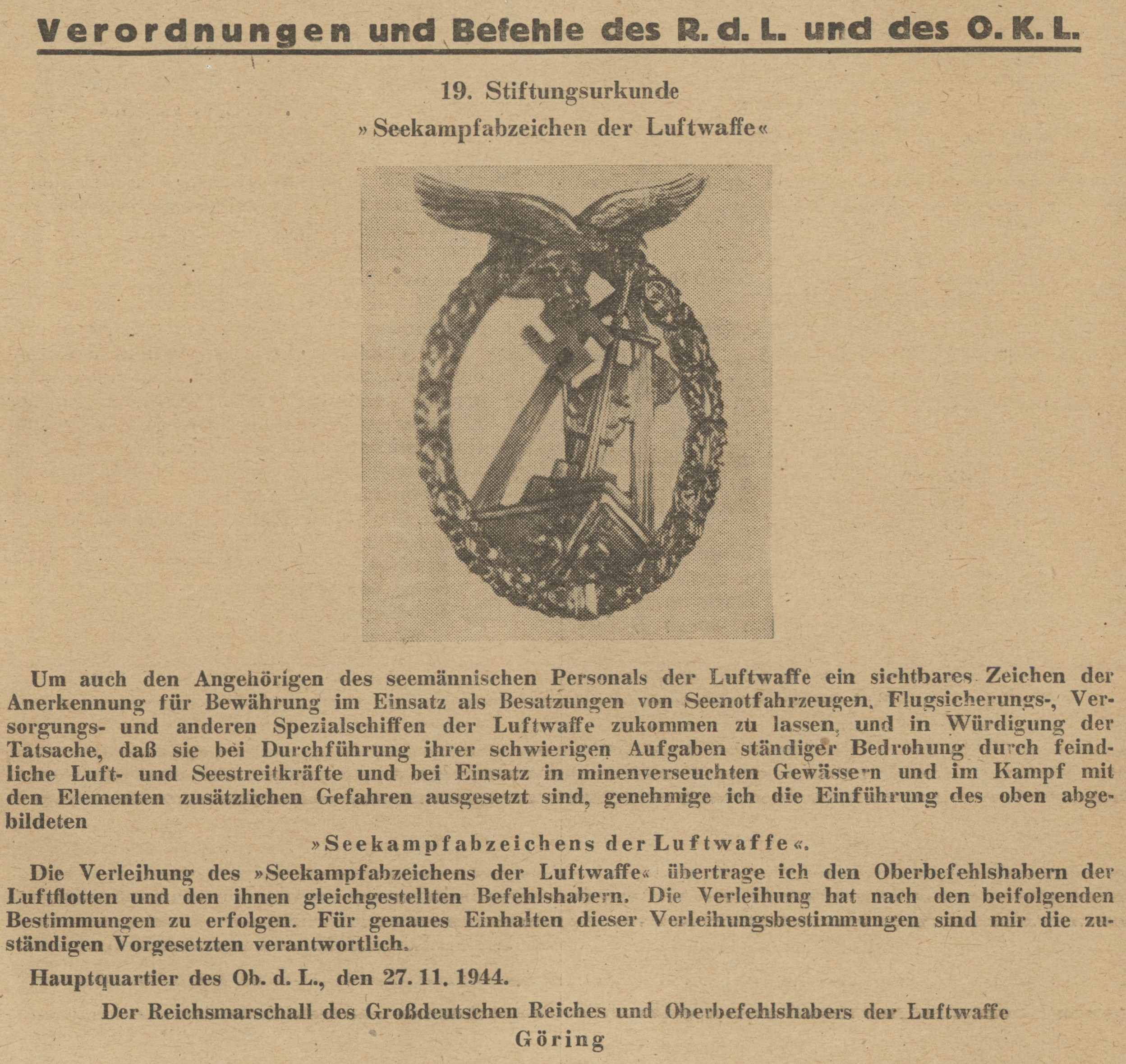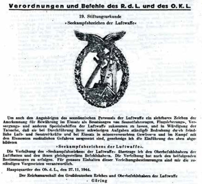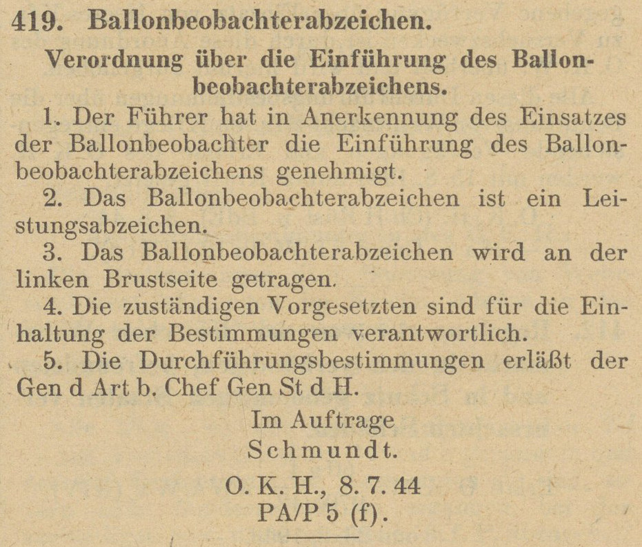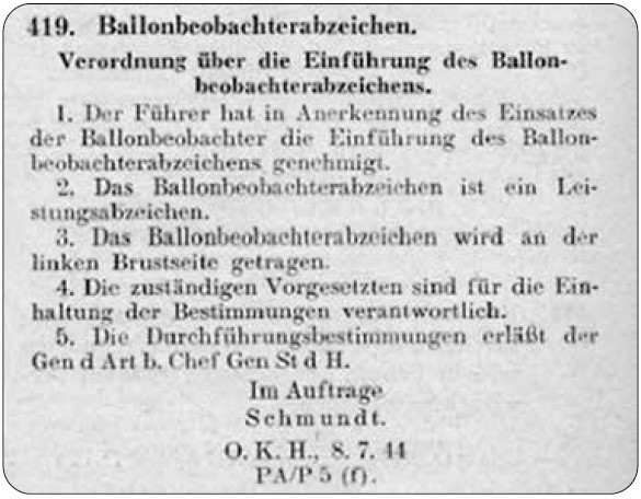 On page 215 of the Reichsgesetzblatt No. 46 (law gazette), published on 29 September 1944, the eighth edition regarding the protection of war badges of the Wehrmacht, dated 7 September 1944 is announced and thus the Balloon Observer Badge is officially introduced. It reads like this: