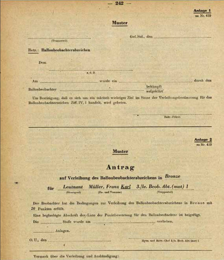 Confirmation is given - in contrast to Section IV - by the commander of the Observer. Dept. to which the observer was subordinate at the time of the services. The applications for former balloon observers are processed by the Observer Dept. to which the observer was attached earlier and are submitted. If balloon observers have documents from their previous assignment work with other units, they must send them to the responsible submission department.