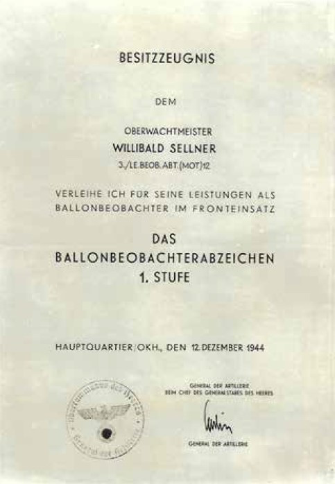 As already described above, Willibald Sellner received his Balloon Observer Badge 1. Grade on 12 December 1944. The original of his certificate was not available, but Dr. Klietmann photographed it for archiving and publication.
