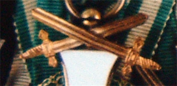 1. In those cases all awards mentioned in § 4 of the statues of the Order of Albert, order decorations as well as those stars belonging to grand crosses and commander crosses first class will show two crossed swords affixed behind the center medallion."