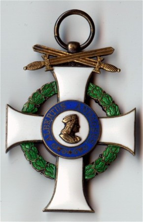 Golden knight cross with swords on the ring. This 1st type cross was not only modified to attach swords on ring, but had also been converted into the 2nd type by replacing the bust on the avers medallion. Swords by Godet in Berlin.