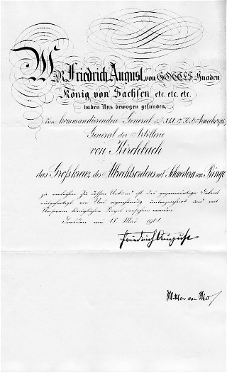 "We Johann by the grace of god king of Saxony have decided to award the Albert Order, founded on December 31, 1850, in its initial 5 grades for merit during war and as military award.