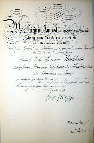 Award documents are extremely rare. So far, only three certificates were found. One is the award document of the last War Minister Hans von Kirchbach for the award of the Grand Cross with swords on the ring in 1908, followed by another one announcing the award of the golden star to the Grand Cross with Swords on the Ring in 1909.