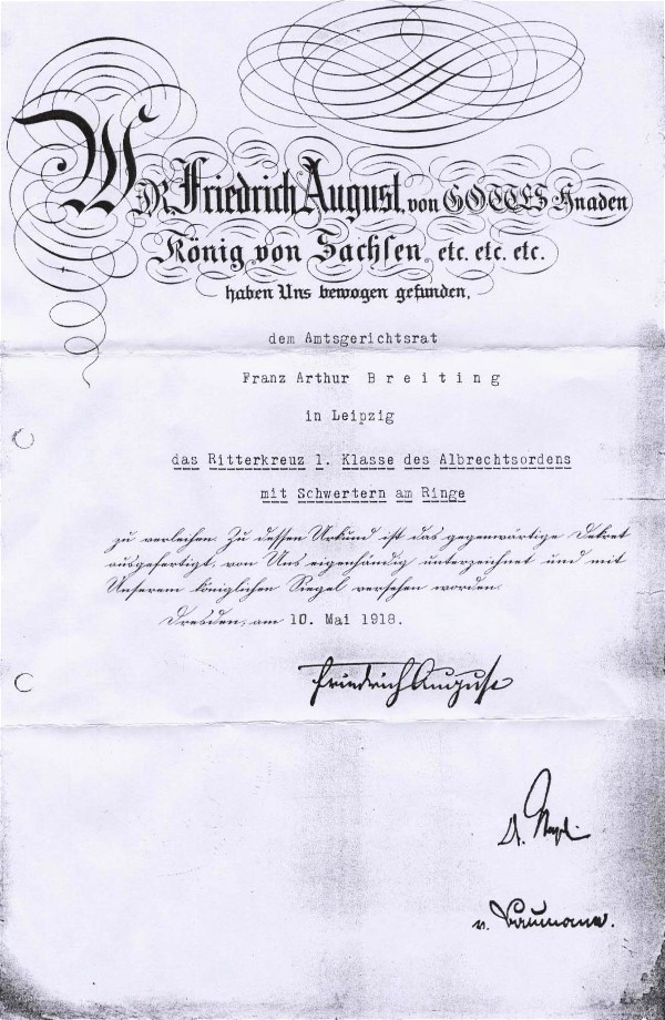 The third document we know about is the certificate for the knight cross 1st class with swords on ring to Arthur Breiting.